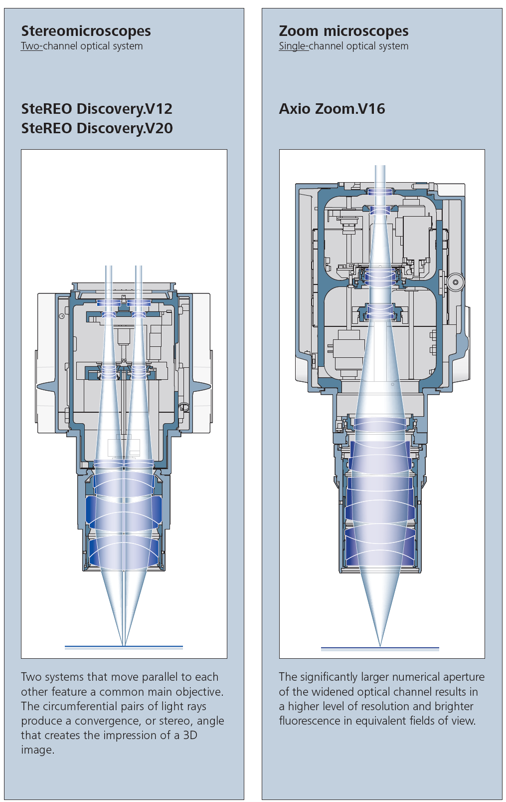 The Axio Zoom.v16 is the perfect balance between a stereo and a compound microscope. We position this microscope as a hybrid system the two where you can benefit from the resolution of a compound light microscope and still have the flexibility of different light sources, stands, and large working distances of a stereo microscope. This is all possible with the single-channel optical system within the Axio Zoom.v16.